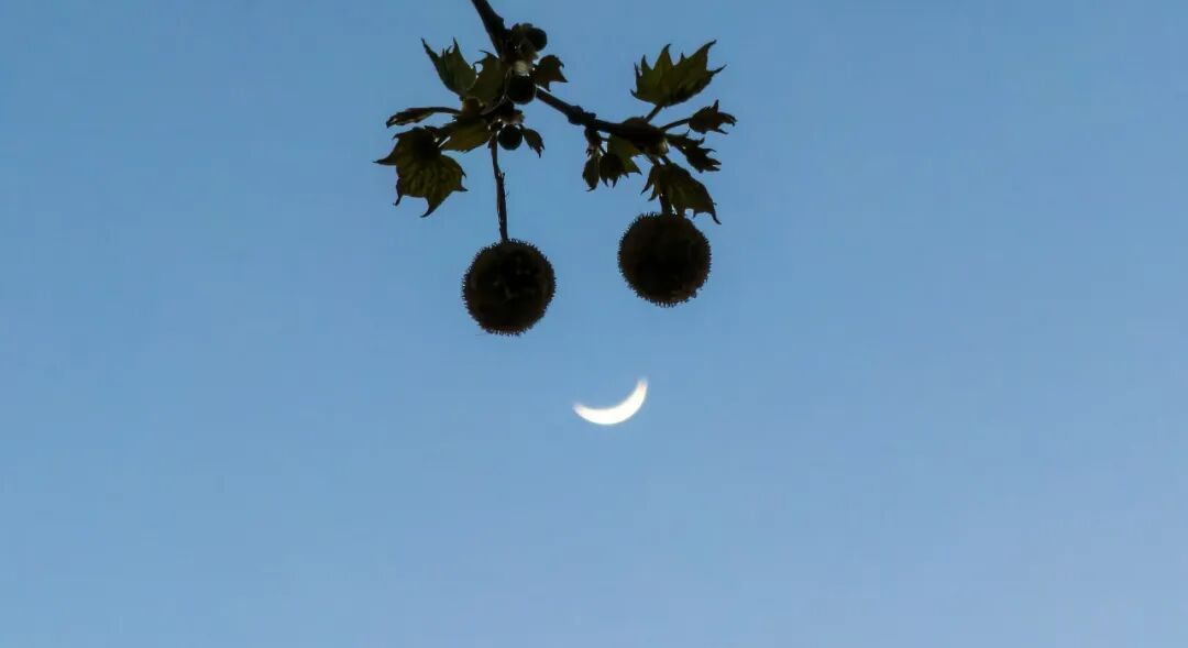 △2025年4月1日,北京,夜空蛾眉月与树枝上的两个小球相互映衬,形成可爱的笑脸。