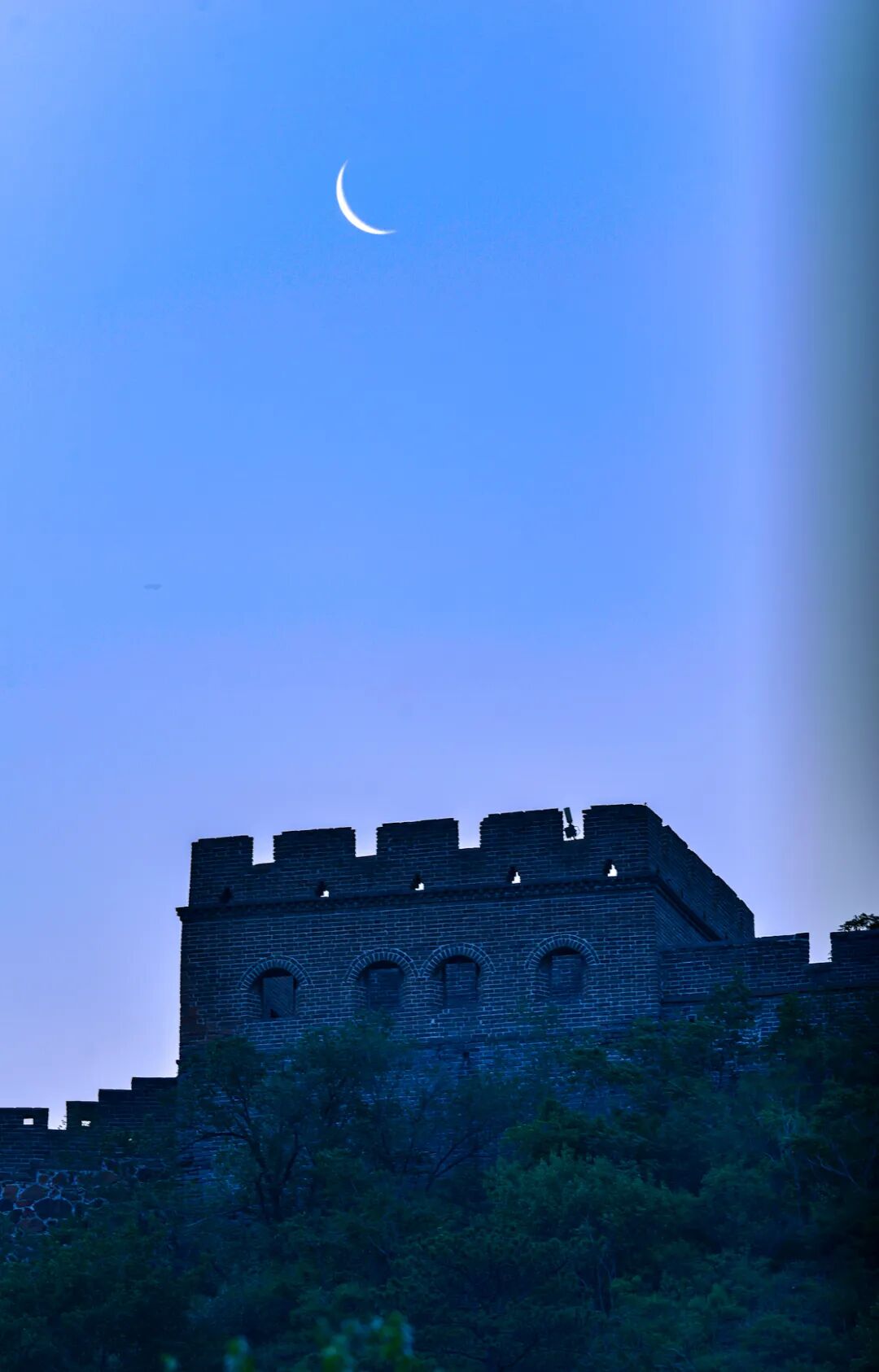△2024年6月4日,河北省承德市滦平县的金山岭长城,一弯峨眉月与长城烽火台遥相呼应。